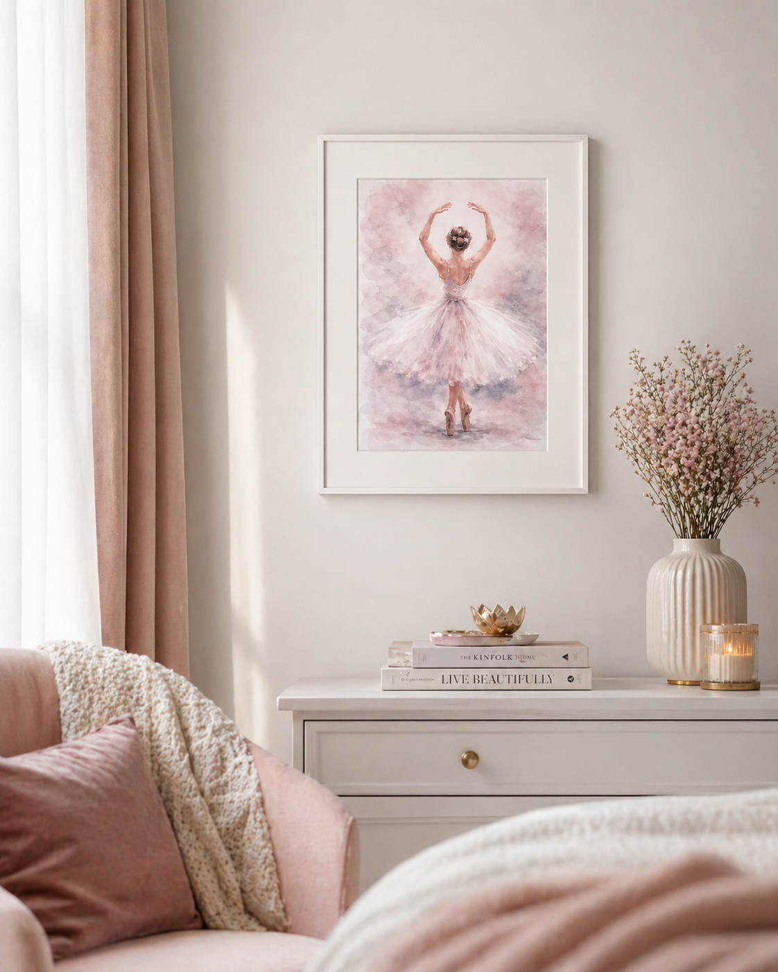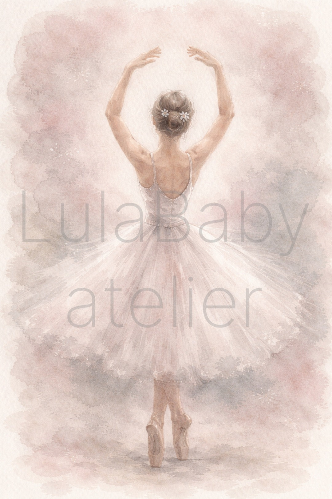 Obraz ukazuje baletnicę widzianą od tyłu, stojącą na pointach z rękami uniesionymi w gracji nad głową. Kompozycja utrzymana jest w delikatnych, pastelowych odcieniach różu, beżu i szarości, co nadaje całości lekkości i wyjątkowego, eterycznego charakteru. Styl przypomina akwarelę – miękki, rozmyty, bardzo dekoracyjny.